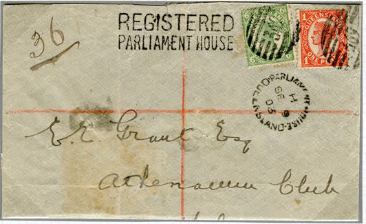 Parliament House datestamp type 3c. Code A. Dated 27 October 1904. Rated 2R. Seen in Status auctions
