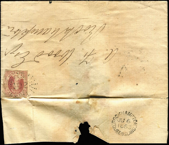 Rockhampton datestamp type 1a dated 6 June 1863. Rated common. Seen in Phoenix auction no 64 lot no 1030