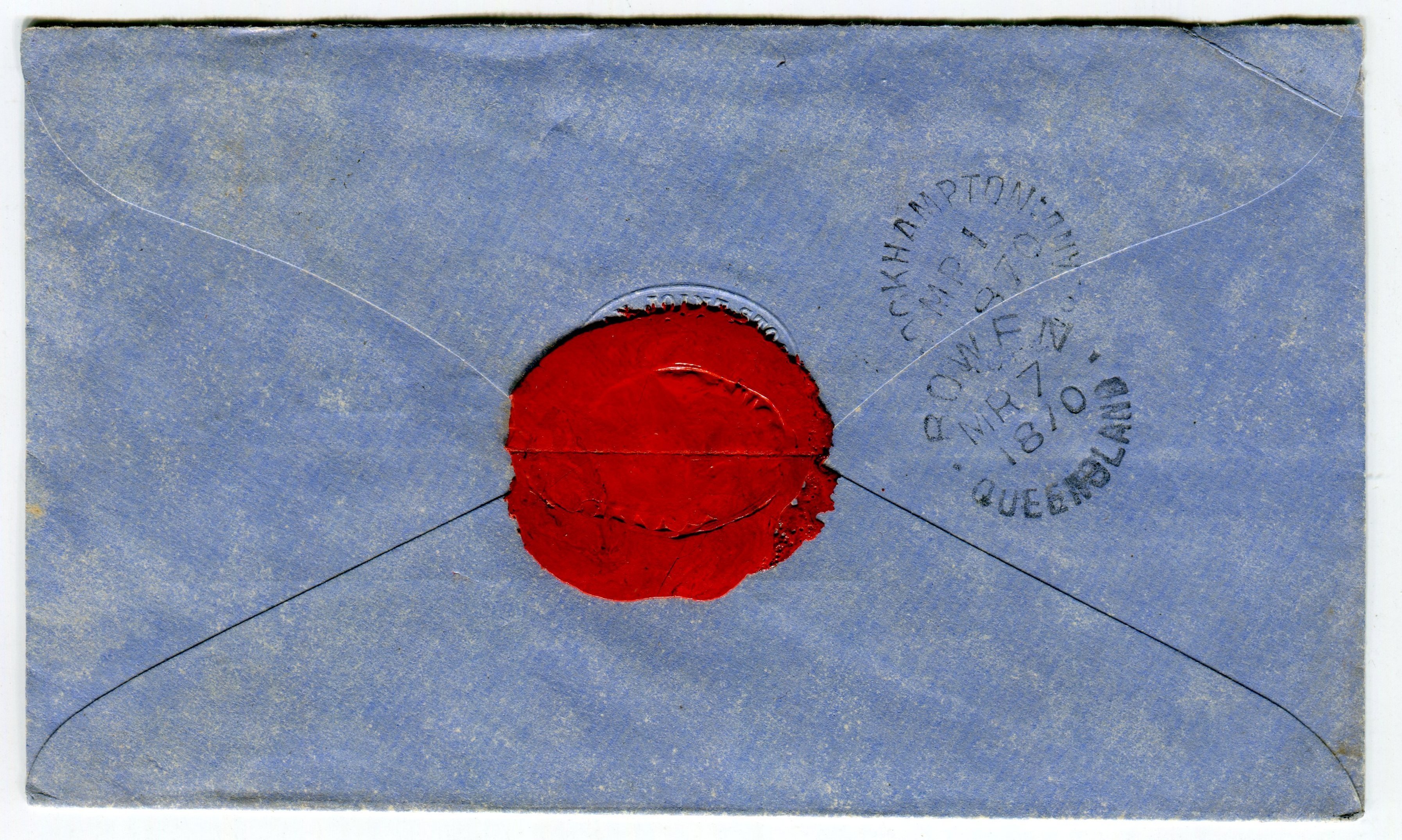 Rockhampton datestamp type 1a dated 9 May 1861. Rated common. Seen in the collection of Carl Burnett